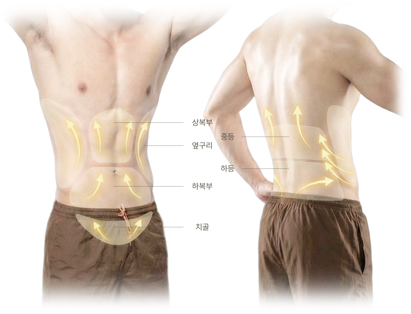 복부 전면, 측면, 후면을 360도로 입체적으로 디자인하여 숨어있던 복근 윤곽을 살리고 균형잡힌 남성미를 구현합니다.