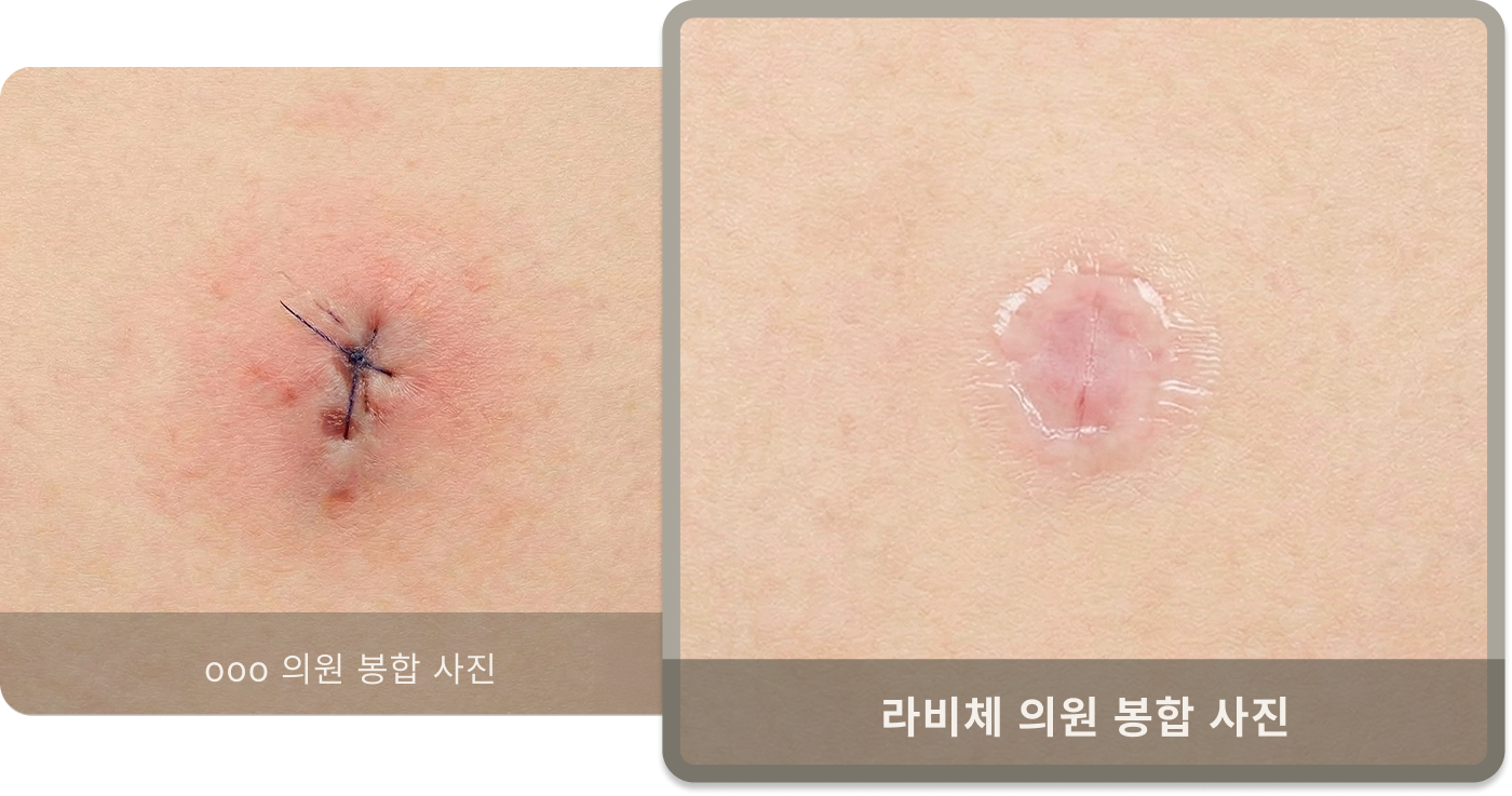 특수 의료용 본드로 봉합하며, 소독과 실밥 제거가 필요 없어 관리가 편리합니다.
