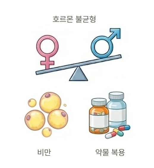 호르몬 불균형, 비만, 약물 복용 등이 주된 원인으로 꼽힙니다.