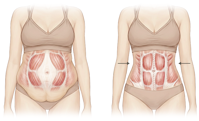 출산 후 벌어진 복직근이 있다면 함께 봉합하여 복부를 더욱 탄탄하게 만듭니다.